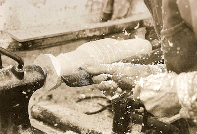 Der grob zugesägte Nabenklotz wird auf der Drechselbank in die richtige Form gebracht. |