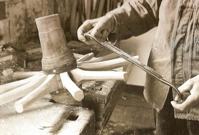 Mit größter Genauigkeit werden nun die Speichen aus Eichenholz eingesetzt. Sie müssen alle ganz gleich gefertigt sein. |