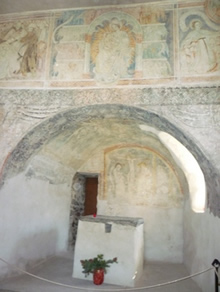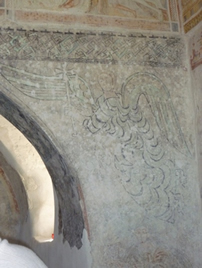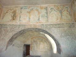 | In der Kirche zeigte uns Heinrich ganz alte Freskenbilder. Er erklärte den Kindern, dass der Maler dieser Bilder damit Geschichten erzählen wollte. |