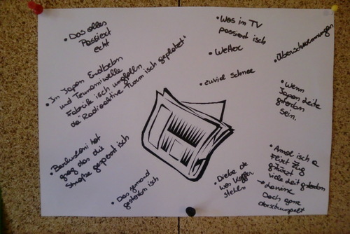 Anhand einer Mind Map sammelten die Kinder ihr Wissen und ihre Erfahrungen zu dem Medium Zeitung. Einige Fragen der Kindergärtnerin unterstützen den Austausch und die Diskussion: