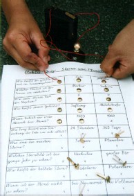 Auf der Rückseite des Spielplans ist die Frage mit der richtigen Antwort verbunden. Wird nun das eine Kabelende mit der Frage und das andere mit der richtigen Antwort verbunden, ist der Stromkreis geschlossen, die Lampe leuchtet.