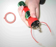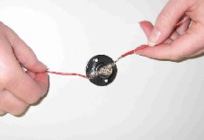 Am anderen Pol der Batterie ist ein Kabel mit einer zwischen-geschalteten Glühlampe befestigt, das mit einer nicht isolierten Öse endet. Diese Öse kann um den stabilen Draht geführt werden.