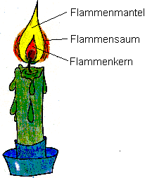 Das flüssige Wachs (oder Stearin) verwandelt sich in der Flamme in Wachsgas. Es ist als dunkler Kern um den Docht herum erkennbar. Dieses Gas zerfällt in seine Bestandteile Kohlenstoff (kleine, glühende Rußteilchen) und Wasserstoff.