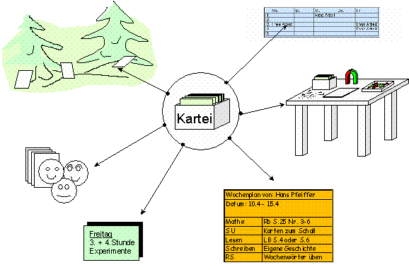 Aufgrund der beschriebenen Absichten, die sich mit der Karteiarbeit verbinden, wird deutlich, dass diese eher direkt auf handelndes Lernen zielt. Die Schüler sollen Gelegenheit erhalten, weitgehend selbständig, einzeln oder mit Lernpartnern Vorhaben oder Ideen nachgehen zu können.
