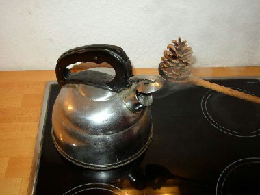 - Erhitze etwas Wasser in dem Kessel und halte den Kiefernzapfen in den aufsteigenden Nebel.