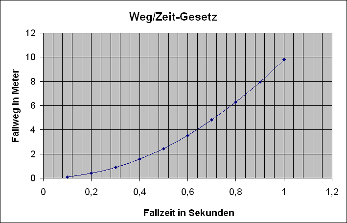 | Fall-Zeit in Sekunden | Zeit zum Quadrat | Erdbeschleunigung g | Fall-Weg in Meter | Zusammenhang | ||||||||