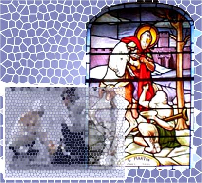 Bild: St. Martin teilt seinen Mantel und gibt dem Bettler "Wärme". Kinder geben den "neuen" Straßen-Bettlern einen Euro.
