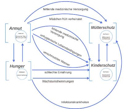 Die verschiedenen weltweiten Probleme hängen zusammen. In dem nebenstehenden Bild sind einige Faktoren aufgezeigt, die die Bereiche Armut, Hunger, Kinder- und Müttersterblichkeit wechselseitig beeinflussen.