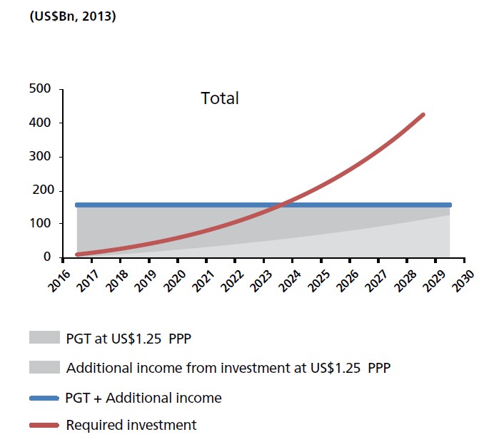 - PGT Transfer to Cover the Poverty Gap ( Betrag, um die Armutslücke zu decken, d.h. die Armen direkt auf ein minimales Einkommen von 1,25 $ pro Tag und Kopf zu bringen)