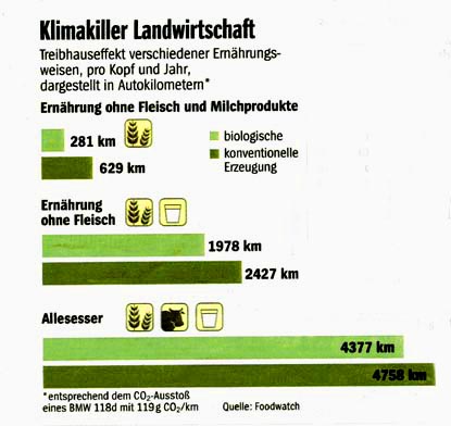 Auch landwirtschaftliche Nutztiere verursachen Treibhausgase. Eine Milchkuh zum Beispiel emittiert im Durchschnitt 111,7 Kilogramm Methan im Jahr. Und weil Methan eine 21mal stärkere Klimawirksamkeit hat als Kohlendioxid, entspricht dies dem CO 2-Ausstoß eines PKW mit einer jährlichen Fahrleistung von 18.000 Kilometern (bei 130 Gramm CO 2 pro Kilometer)."