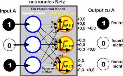 Das obere Neuron der Output- Schicht erhält über seine Synapsen den Gesamt-Input 1. Er ist größer als das AP von 0,8, also feuert das oberste Output- Neuron. Der entsprechend berechnete gewichtete Input des mittleren Neurons beträgt 0,6 der des unteren Neurons -0,6.