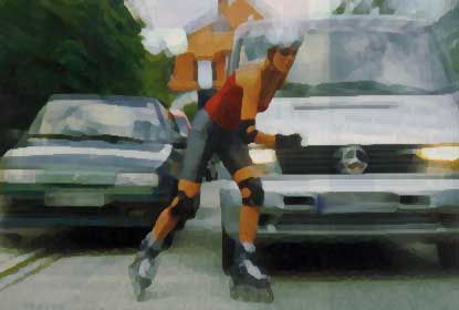 "Der Fahrradfahrer verliert! vlü, 2004 Bildcollage, mit dem Computer hergestellt.