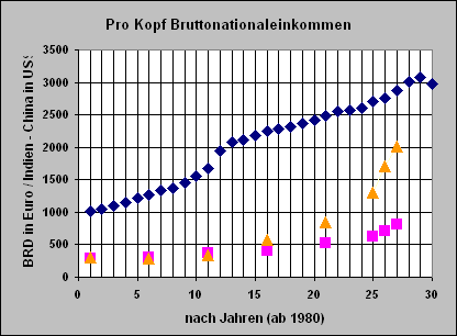 Im weiteren stellen wir die Entwicklung des Pro-Kopf-Brutttonationalproduktes in Deutschland (in Euro) sowie in Indien und China (in US$) zum Vergleich im selben Diagramm dar.
