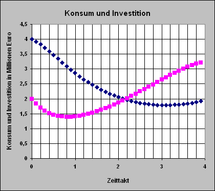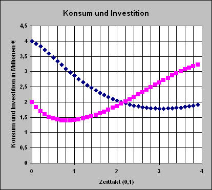 Die Koeffizienten, die in obigem Wechselwirkungsmodell für Konsum und Investition gewählt wurden, werden hier beibehalten. Lediglich für Δt wird 0,1 gewählt. Das entspricht aber der zweiten oben dargestellten Simulation.