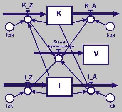 Die Grenzen dieses Modells liegen aber immer in den Annahmen, die in dem Flussdiagramm zu sehen sind. Denkbar wären auch andere Wechselwirkungs-Kopplungen zwischen Konsum und Investition. Und es gibt auch einen Zusammenhang von Konsum und Investition mit dem Volkseinkommen. |