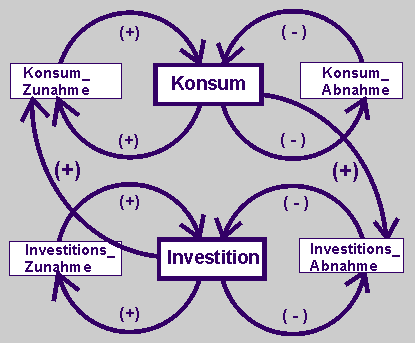 Höhere Investitionen, also ein höherer Kapitaleinsatz, wirken auf den Konsum positiv. Je größer die Investitionen sind, desto mehr wird konsumiert. Umgekehrt wirkt aber ein höherer Konsum auch verstärkend auf die Investitions_Abnahme. Je größer der Konsum wird, desto weniger wird investiert.