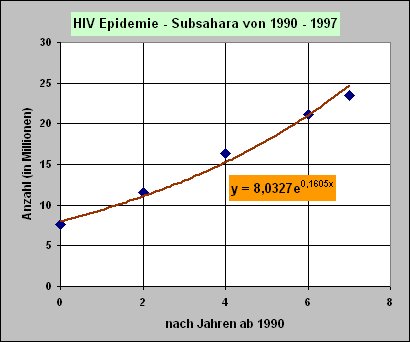 Wir untersuchen nun die Entwicklungen zur Ausbreitung des HI-Virus genauer und approximieren den Verlauf mit exponentiellen und polynomischen Trendlinien (Funktionen).