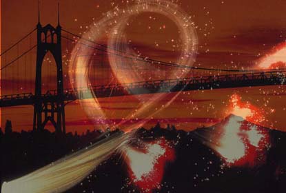 Massive Hängebrücken verlagern ihre Kräfte über Trageseile in den Boden. Energien erscheinen am Abendhimmel und werden in "Drähten" übertragen.
