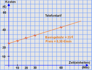 Den einzelnen (Zahlen)Paaren entsprechen die "Kreuze" auf der obigen linken Geraden. Aber zwischen diesen wenigen Kreuzen (Punkten) liegen noch (unendlich) viele weitere Punkte, die alle dieselbe Abhängigkeit beschreiben. Die Geraden beschreiben vollständiger als die Wertetabellen die Kosten-Zeit-Abhängigkeit. Diese Abhängigkeit lässt sich sich als Paarmenge mit einer Funktionsgleichung wie folgt schreiben:
