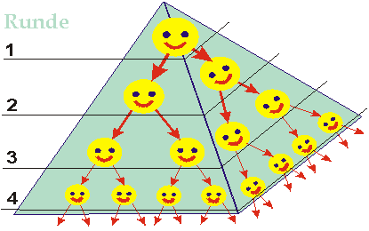 Ein Kind beginnt. Das ist die nullte Runde oder die erste Ebene. Es gibt die Nachricht an zwei Kinder weiter. D.h. nach der ersten Runde gibt es zwei Kinder, die neu mit der Nachricht infiziert wurden. Insgesamt gibt es jetzt also drei Kinder, die mit der Nachricht infiziert sind. Alle Infizierten geben die Nachricht weiter. ... |