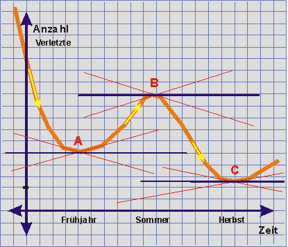 A und C des Graphen kennzeichnen minimale Anzahlen. Legt man links und rechts von diesen Punkten Sekanten an den Graphen, so wechselt die Steigung der Sekanten von negativ nach positiv. Und dazwischen liegt eine Sekante (blau), die gar keine Steigung hat bzw. deren Steigung Null ist.