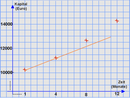 Das Kapital von 10.000 Euro wächst überlinear an, weil die Zinsen zum Kapital addiert auch wieder Zinsen liefern.