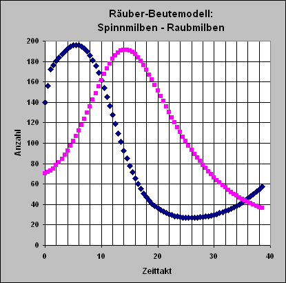 Würden nach zwei Monaten die Pflanzen aber nicht geerntet, so würden sich die Spinnmilben wieder vermehren. Der dargestellte Wachstums-Prozess würde sich mit anderen Maxima und Minima für die Spinnmilben und Raubmilben wiederholen. Beide Arten überleben! |