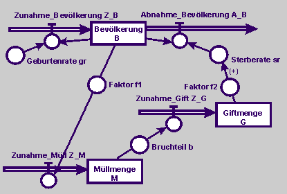 Bevölkerung (B), Müllmenge (M) und Giftstoffe (G) werden im folgenden Flussdiagramm als Zustandsgrößen betrachtet. Das Wachstum der Bevölkerung wird mit den Flussgrößen Zunahme_Bevölkerung (Z_B) und Abnahme_Bevölkerung (A_B) modelliert. Auf die Flussgrößen wirken die Geburtenrate gr und die Sterberate sr. Die Sterberate erhöht sich aber additiv durch die "Giftmenge". Die Müllmenge ist mit einem Faktor f1 an die Bevölkerung und die "Giftmenge" ist mit einem Bruchteil b an die Müllmenge gekoppelt. Als Giftmenge wird die Masse des Sondermülls genommen. Ein Teil davon (Faktor f2) erhöht die Sterberate. |