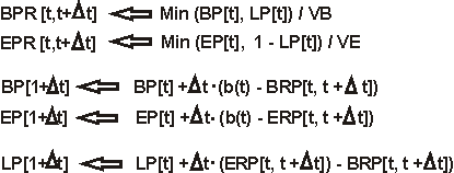 In der letzteren Gleichung modelliert der Term "1- LP[t]" die Systemeigenschaft, dass nicht mehr als die aktuell noch verfügbare Kapazität des Leistungspotentials, d.h. die Differenz zwischen dem Maximalwert "1" und dem aktuellen Bestand LP[t], nach LP fließen kann.