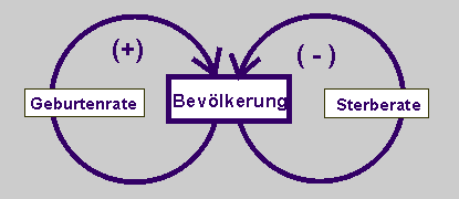 Bei Vernachlässigung der Größen Fruchtbarkeit und Sterbeziffer kann das Wirkungsdiagramm auch wie folgt aussehen: Es besteht aus zwei Rückkopplungskreisen. Der eine ist positiv. Je mehr Menschen leben, umso mehr Kinder werden bei gegebener Geburtenrate geboren. Der andere Rückkopplungskreis ist negativ. Je mehr Menschen leben, umso mehr werden sterben, bei gegebener Sterberate. |