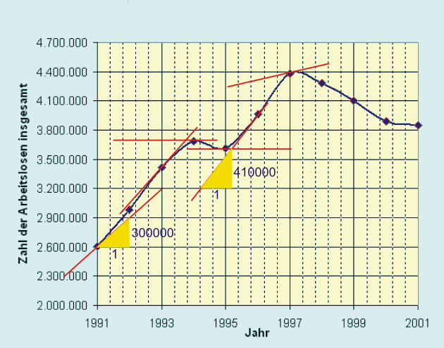 - Modelliert an ausgezeichneten Stellen (etwa: 1991, 1992, 1993, 1994, 1995, 1996, 1997) mit der Steigung von Tangenten an die Kurve die Zu- bzw. Abnahme der Arbeitslosenzahl.