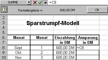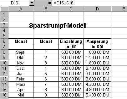 Nebenbei: Die Spalten "Einzahlung" und "Ansparung" lassen sich mit "Format > Zelle > Währung" auf Euro formatieren.