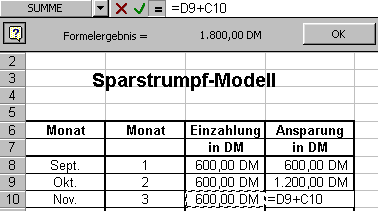In die Zelle D10 wird auf dieselbe Weise =D9+C10 eingeschrieben.