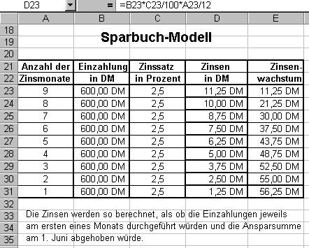 In Zelle D23 wird der Term eingeschrieben =B23*C23/100*A23/12