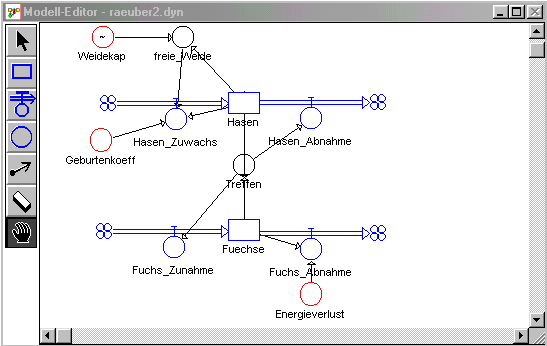 Beschreibung: Die in einem begrenzten Gebiet vorhandene Weide lässt den Bestand der Beute bis an die Grenze der Weidekapazität wachsen. Räuber verringern jedoch den Beutebestand entsprechend der Häufigkeit des Zusammentreffens zwischen Räuber und Beute, die von dem Bestand beider Populationen abhängt. Ohne Energiezufuhr durch Beutetiere verhungert der Räuberbestand."