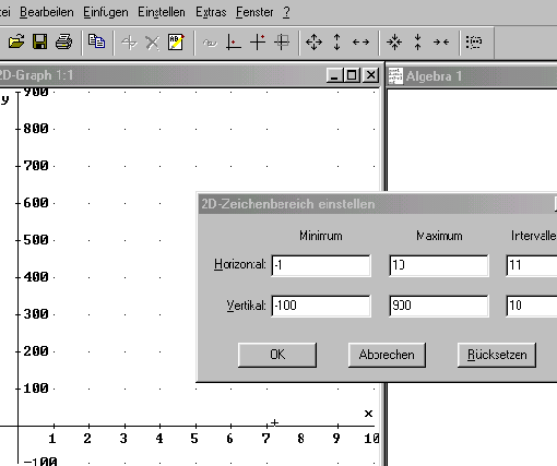 Im aktiven Grafikfenster wird mit Einstellen > Zeichenbereich ein Eingabefenster geöffnet. Dort werden die Randbedingungen zum konkreten Fall eingegeben. In diesem Fall soll die x-Achse von -1 bis 10 mit 11 Intervallen und die y-Achse von -100 bis 900 mit 10 Intervallen eingerichtet werden. |
