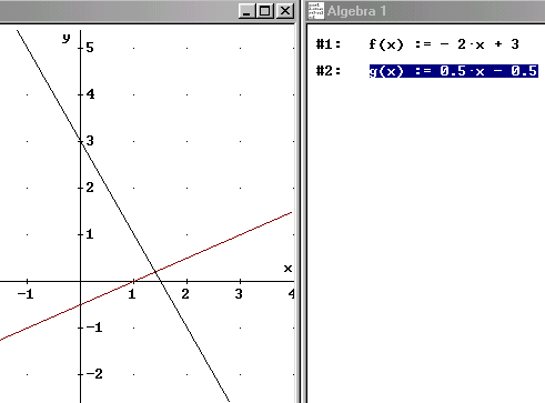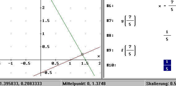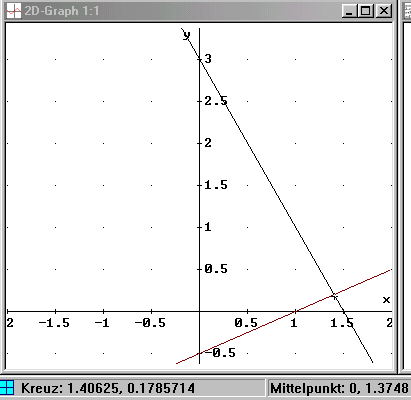 Klickt man nun im Grafikfenster mit dem Cursor auf die Gerade f(x), so werden in der Statuszeile die Koordinaten des Punktes angezeigt. Im nebenstehenden Bild steht der Cursor nahezu auf dem Schnittpunkt. Er liege bei (1.40625 / 0.1785714) "sagt" die Statuszeile. Und: Vielleicht geht es mit guten Augen noch genauer!
