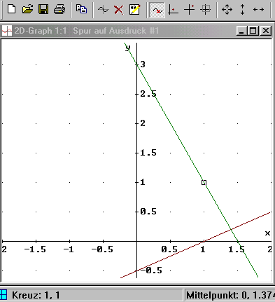 Im Grafikfenster ist der Spurpunkt auf den Schnittpunkt gesetzt worden. Die geometrische Lösung (1.395833 / 0.208333) weicht von der exakten algebraischen Lösung (1,4 / 0,2) minimal ab. |