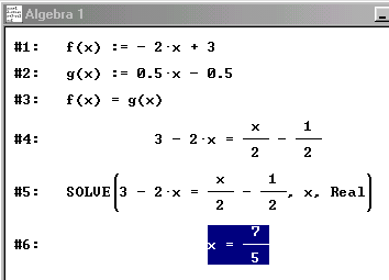 Das Algebrafenster wird aktiviert. Über die Eingabezeile gibt man für den Schnittpunkt die Bedingung #3: f(x) = g(x) ein, denn für den Schnittpunkt sind die Funktionswerte gleich.