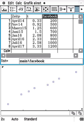 | Unsere Modellierung geht von einem Maximal(Sättigungs-)wert aller Nutzer des Facebook-Messengers aus, der ungefähr bei 1,35 Mrd. liegt. Renditeverwöhnte Wertpapieranleger könnte dies abschrecken und dies könnte möglicherweise in der Folge zu einem Wertverlust bei den Aktien führen. Schauen wir uns die vorgegebenen realen Werte an, liegt die Vermutung nahe, dass eine Modellierung durch ein Gerade, die immerhin ein konstantes Wachstum verspricht, der Situation angemessener sein könnte. Das wollen wir nun mit dem ClassPad überprüfen. |