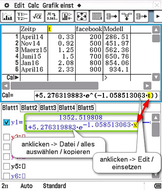 Zunächst klicken wir den Term hinter y1 = an, markieren mit Datei / alles auswählen den ganzen Term und kopieren ihn mit kopieren in die Zwischenablage. Anschließen geben wir einer neuen Spalte den Titel 'Modell' und klicken auf das Feld zur Eingabe eines Terms am Fuß der Liste. Nun klicken wir in das Eingabefeld hinter 'Cal =' und wählen Edit / einfügen.