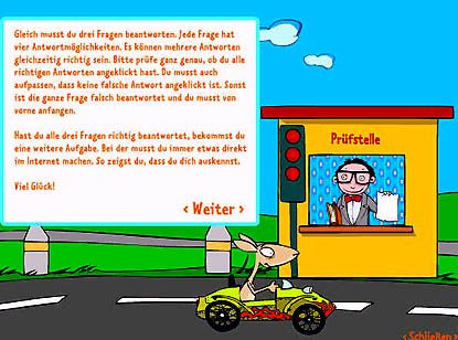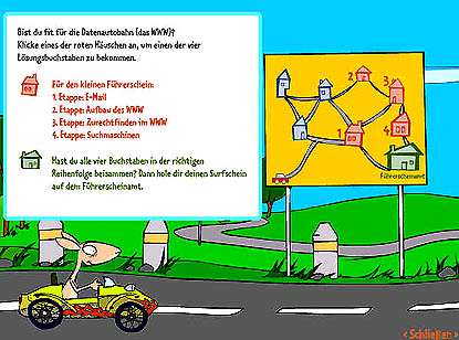 Einige bewertende Anmerkungen zum Erwerb eines Surfscheines Klickt man in der Übersicht oder bei Jumpy auf "Surfschein", dann erhält man die nebenstehende Seite. Nach Klicken auf "Start" fährt Jumpy mit seinem Auto ab. Mit einer hocherhobenen Fahne LOS fährt er bis zu einem Verkehrsschild, auf dem eine Etappen-Wahl zu treffen ist. |
