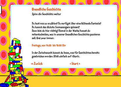 Einige bewertende Anmerkungen zur "unendlichen Geschichte" Dieser Teil vom "Internet-ABC" kann als eine (kooperative) Schreibwerkstatt betrachtet werden. Man kann selbst produktiv werden und an einer Geschichte zu Flizzy schreiben. Man kann aber auch bereits zu Ende geschriebene Geschichten einfach nur lesen. Unklar ist, warum diese "Werkstatt" unter Spiele eingereiht worden ist. Die "unendliche Geschichte" ist also als Werkzeug ein beispielhaftes Neues Medium. |