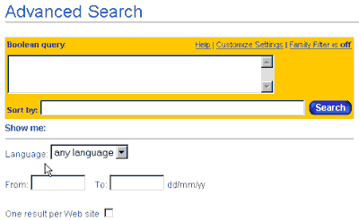 | Werden beim Schreiben dieser Ausdrücke und Begriffe einige Regeln (wie Trunkierungen oder Phrasenbildungen) beachtet ist die Suche erfolgreicher. Weiter kann die Sprache, in der die gesuchten Dokumente (Seiten) verfasst sein sollen, eingestellt werden. (Somit sind die Suchen auf Deutschland oder England oder NN beschränkbar oder auf das ganze Internet beziehbar.) Natürlich sind boolsche Suchen, ein Suchen unter ganz speziellen "Categories" möglich. Zusätzlich kann die Suche auf einen Zeitraum oder u.a. auf Bilder oder Überschriften eingeschränkt werden. Natürlich bleiben alle Einstellmöglichkeiten der einfachen Suche erhalten. Alle Beschreibungen sind in englischer Sprache formuliert. | ||||