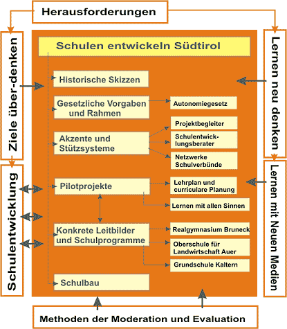 In allen europäischen Ländern sind Schulen in Bewegung. Ziele und Inhalte des Lernens werden überprüft und verändert und die Verantwortlichkeiten für die Steuerung des Bildungswesens werden neu geordnet. Dies geschieht auf der Basis der dynamischen gesellschaftlichen, wirtschaftlichen und technischen Entwicklungen sowie der Veränderungen der kulturellen Traditionen. In der Regel vollziehen sich daher die Entwicklungen regional, so auch in Südtirol. Doch es gibt auch gemeinsame Grundlagen. Lerntheoretisch