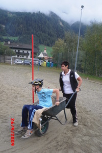 | Uns hat das Schubkarrenrennen am besten gefallen! Unsere Eltern oder jemand vom Sportclub schoben uns mit dem Schubkarren durch einen aufgestellten Lauf. Mein Vater schob sogar meinen Bruder Lukas und mich (Florian) mit dem Schubkarren. Ich, Gabriel, schaffte mit meiner Mutter sogar den 3. Platz. Gabriel und Florian 5. Klasse Bei der Kinderolympiade gab es viele Spiele. Wir durften Zylinder stechen, Rad fahren, laufen, Sack hüpfen, weitspringen. Als wir mit den Spielen fertig waren, bekamen wir noch ein Würstchen und etwas zum Trinken. Ganz am Schluss schenkte uns Paul vom Sportclub ein paar alte Pokale. Meine kleine Schwester Doris war sogar auf einem Foto drauf. Marlene, Carmen, Maria 5. Klasse |