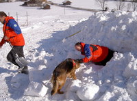 Besuch der Bergrettung In diesem Schuljahr machten wir das Projekt „Schnee: Spaß und Gefahr“. Dazu lud die Schule auch die Bergrettung ein. Sie kamen am Samstag, den 13. Februar. Die zwei Männer hatten auch zwei Hunde mit. Sie erklärten uns die Ausrüstung und auch, wie man solche Rettungshunde aufzieht und was sie alles können sollen. Im „Taschfeld“ zeigten die Männer uns dann wie schnell die Hunde etwas ausgraben können. Die Lehrer wählten ein paar Kinder aus, die im Loch begraben wurden, das schon vorher gemacht wurde. Ein Mann der Bergrettung war natürlich auch bei den Kindern im Loch. Nachdem die Kinder und der Mann unter dem Schnee verschwunden waren, musste einer der Hunde sie suchen. Er fand sie sehr schnell. Eine andere Gruppe von Kindern musste der zweite Hund suchen. Auch er musste sich nicht so sehr anstrengen und fand sie gleich. Es waren sehr folgsame Hunde. Sie folgten aufs Wort des Bergretters. Es war ein sehr interessanter Vormittag.  |