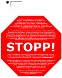 Entwurf eines Stoppschildes (April 2009), das beim Aufruf gesperrter, als kinderpornografisch indizierter Seiten angezeigt werden sollte. Die Stoppmeldung sollte gemäß Gesetz den Nutzer über die Sperrung der Seite, die Gründe hierfür und die Kontaktmöglichkeit zum Bundeskriminalamt informieren. Die Ausgestaltung der Stoppmeldung sollte durch das Bundeskriminalamt erfolgen. |
