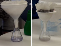 | Leitungswasser, Erde, Kies, Tinte, Messbecher 2x 100ml, Kaffeefilter, 2 Becher, 2 Trichter 1. Nimm 2 Becher mit 100ml Wasser. 2. Gib 3 Tropfen Tinte in jeden Becher. 3. Nimm die beiden Trichter und die beiden Kaffeefilter. Gib jetzt in den ersten Kaffeefilter fünf Löffel Kies. Gib jetzt in den zweiten Kaffeefilter fünf Löffel Erde hinein. 4. Nimm jetzt die beiden Becher mit dem Wasser, das mit je 3 Tropfen Tinte verschmutzt ist Gib es zugleich über die Erde und den Kies. 5. Beobachte •Beim Kies fließt das Wasser schneller durch, doch das Wasser bleibt blau. Der Kies speichert das Wasser nicht •Bei der Erde jedoch verschwindet die blaue Farbe. Die Erde speichert das Wasser und der Schmutz bleibt in der Erde - Kies säubert das Wasser nicht, Erde speichert und säubert Wasser